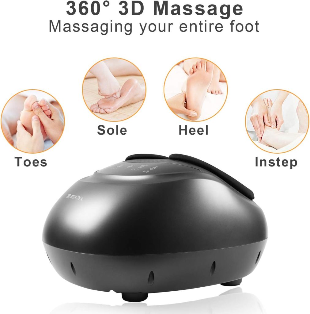 The Foot Massager is a wonderful device designed to ease tired, aching feet and bring you real relaxation. It uses deep kneading shiatsu rolling, air compression, and gentle heat to soothe your feet, relieve pain, and make you feel brand new.